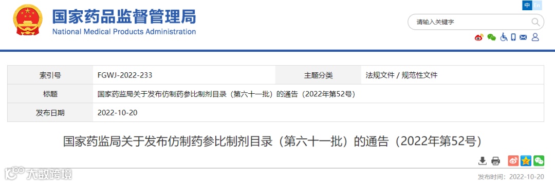 2022年10月20日,国家药监局发布了第61批次仿制药一致性评价参比制剂目录,其中新增品种57个、变更持证商品种5个、增加持证商品种10个。