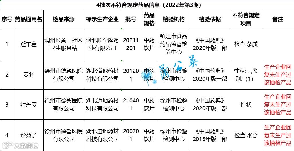 现将抽检中发现的4批次不符合规定药品信息予以通告,涉及饮片:淫羊藿、麦冬、牡丹皮、沙苑子;