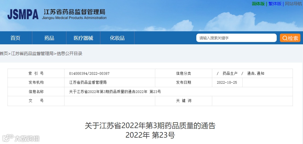 2022年10月25日,江苏药监局发布了药品质量抽查检验结果通告,共4批次药品抽检不符合规定、全部为中药饮片,其中3批生产企业回复未生产过该抽检产品;对抽检不符合规定药品,药品监督管理部门已要求相关企业和单位采取暂停销售使用、召回等风险控制措施。