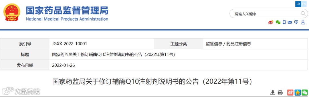 2022年01月26日,基于不良反应评估国家药监局发布了3则修改说明书公告,共计涉及8个品种,具体为辅酶Q10注射剂(辅酶Q10注射液和辅酶Q10氯化钠注射液)、含碘对比剂(碘海醇注射液、泛影葡胺注射液、复方泛影葡胺注射液、碘美普尔注射液)、硝呋太尔口服制剂(硝呋太尔片和硝呋太尔胶囊),要求于2022年4月24日前完成备案工作。