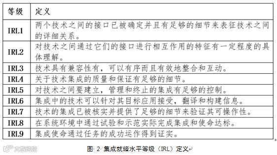 针对 TRL 的局限,戈夫等于2007引进了集成准备就绪水平(IRL)的概念来测量集成成熟程度,这个 IRL 的等级和TRL的等级相对应,其目的是将它和 TRL 结合起来以对系统就绪水平进行评估。关于 IRL 的描述可见图2。