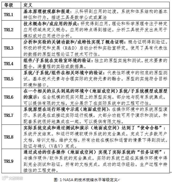 在漫长的技术研发的过程中,不断对其成熟程度进行判断有着广泛而重要的意义。技术研发的相关各方需要一个简单明了的标杆来在项目各个阶段理解技术的成熟度。这样的标杆,在美国科技研究界被称为技术就绪水平(TRL),这个衡量系统是美国航空航天局(NASA)首先发明的。研发之初,TRL有七个等级标准。在20世纪90年代,NASA 采纳了一个新的有九个等级的标准,这个新标准被西方各行各业广泛接受并一直沿用至今。如今这个 TRL 标准已经成为西方公司项目进行技术成熟度评估的最主要工具之一。
