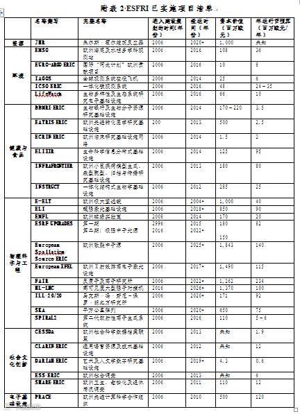 2016年路线图的项目分为两类,一类是一般性项目,另一类是已实施项目(原报告称这类项目为 Landmark projects,即标志性项目)。已实施项目是指已经开工建设、正在实施、并向用户提供优质服务的项目。这是 ESFRI 根据对以往路线图中项目的评估结果和新提交项目建议书的评估结果而确定的。