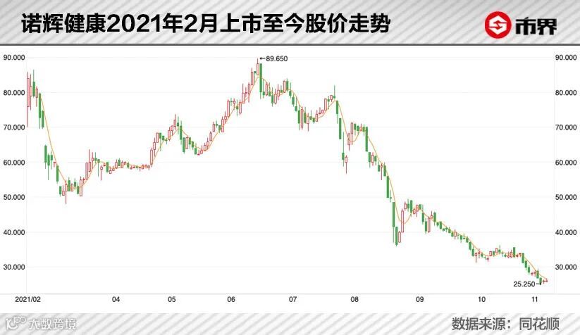 被资本捧起来的诺辉健康,6月中旬股价在创下89.65港元/股的新高后,便开启“阴跌”模式,截至11月5日收盘,股价已较高峰时期跌去近七成,市值蒸发超200亿港元,至112亿港元。
