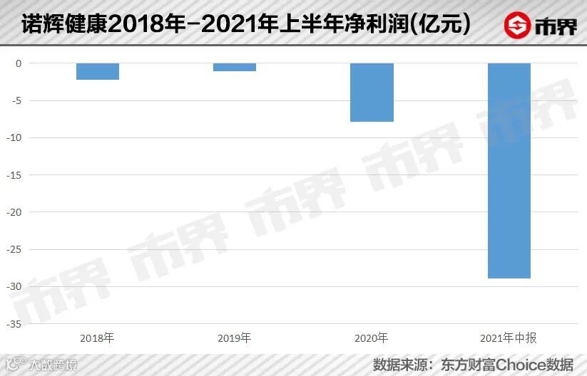 诺辉健康的亏损却还在持续。2019年-2021年上半年的亏损分别为1.06亿、5.34亿元以及28.9亿元。对于上半年亏损扩大,诺辉健康将主要原因归因于优先股的公允价值亏损,剔除后的净亏损为9993.4万元。