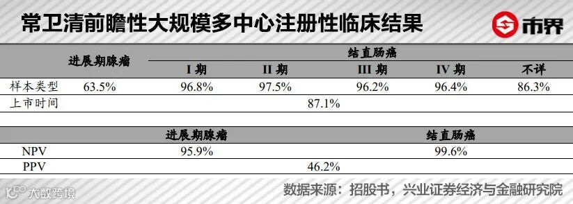 常卫清对外宣称的NPV阴性预测值是99.6%,即如果显示为阴性,则99.6%的概率未患病,因此无需再进行肠镜检查;PPV阳性预测值是46.2%,即结果如为阳性,则检测者者有46.2%的概率患有结直肠癌或腺瘤。