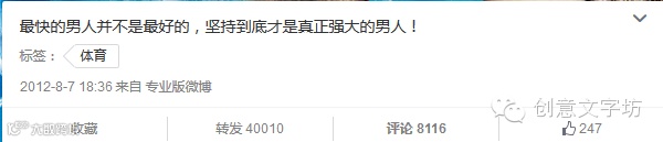 2、2012年奥运会,刘翔旧伤复发,跨栏摔倒,但坚持走完全程。杜蕾斯对此发出如下微博:最快的男人并不是最好的,坚持到底才是真正强大的男人!