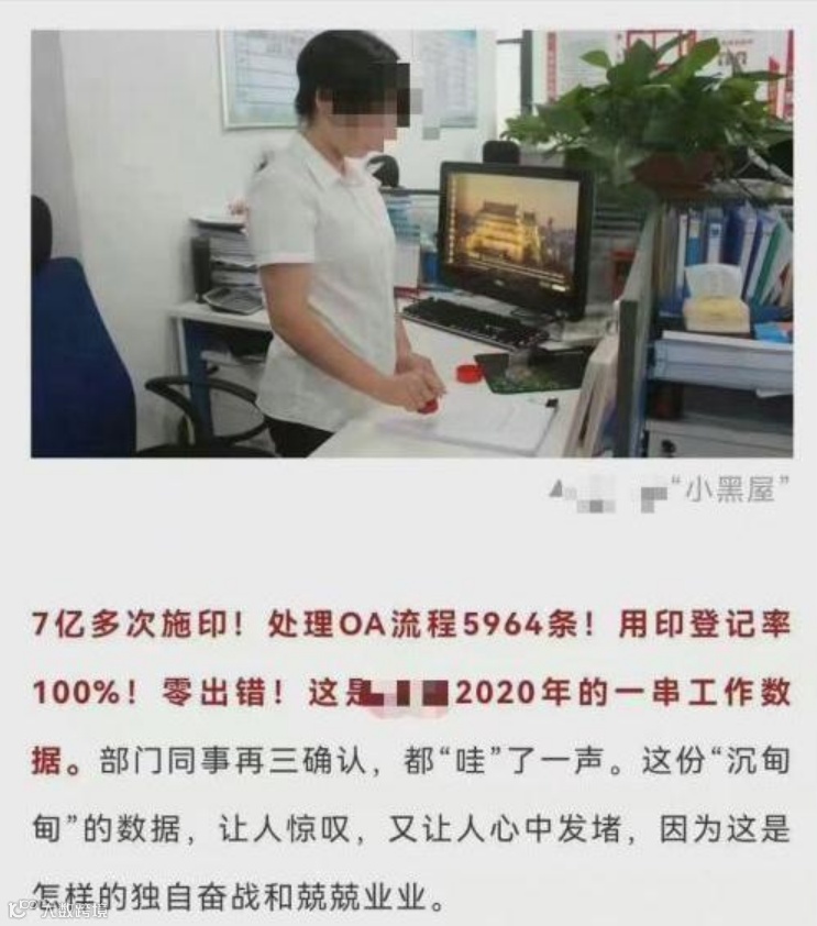 近日,中建四局贵州投资建设有限公司一篇宣传企业的报道提到,其员工在2020年施印7亿多次,处理OA流程5964条,用印登记率100%,并且零出错……此后,有网友指出,即便这名员工一年365天24小时无休,平均每分钟也要施印1300多次,还不算登记用印和处理OA的时间,超越“机枪射速”和人类极限。对此,中建四局回应称,报道乃“笔误和审核不严”所致,将严肃处理并进一步加强信息发布管理。