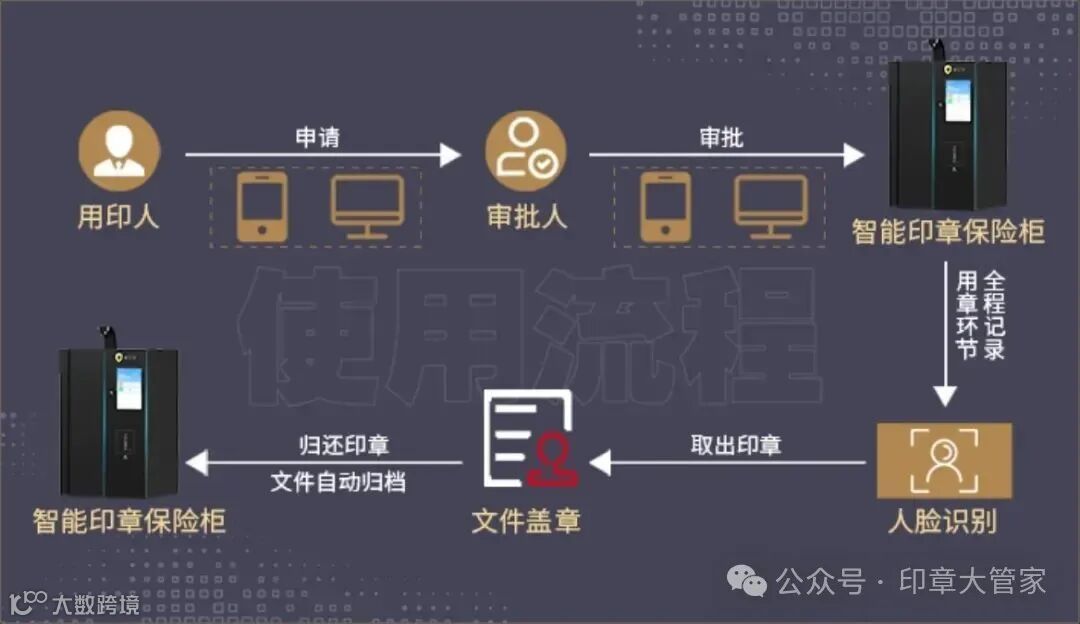 “印章大管家智能印章柜”正好解决了这个严峻的问题,印章大管家印章安全管理解决方案,是创新运用大数据、人工智能、物联网、区块链等技术和应用,通过智能印章保险柜和印章大管家云平台,实现总公司、分公司所有印章在线远程管理,将用章申请、审批、盖章、归档、归还、统计分析等进行全流程监控,以升级企业传统盖章场景,杜绝企业用印安全隐患,构建更加高效、智能、快速的印章管理模式。
