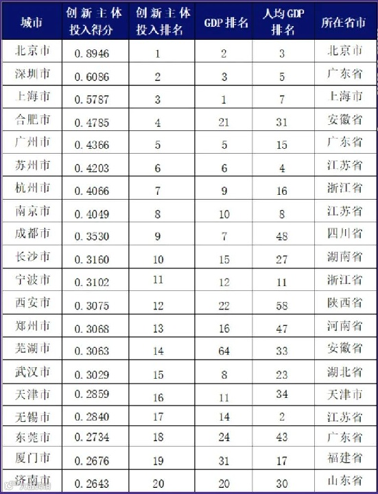 创新主体投入前20强城市可大致分为5个组。其中,北京市得分最高,属于第一组。深圳市、上海市属于第二组。北京市、深圳市和上海市创新主体投入得分较高与其经济实力有着不可分割的关系。合肥市、广州市、苏州市、杭州市和南京市共5个城市位于第三组。成都市、长沙市、宁波市、西安市、郑州市、芜湖市和武汉市共7个城市位于第四组。天津市、无锡市、东莞市、厦门市和济南市共5个城市位于第五组,后三组的创新主体投入得分差异较小。北京市、深圳市和上海市大幅领先其他城市。