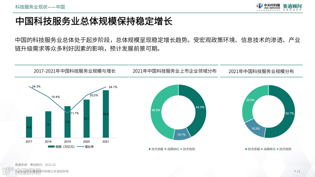 6月8日,中关村科服、赛迪顾问联合发布《2022中国科技服务业发展年度报告》。数据显示,中国的科技服务业总体处于起步阶段,总体规模呈现稳定增长趋势,2021年中国科技服务业规模达10.8万亿元。