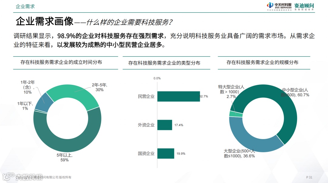调研结果显示,98.9%的企业对科技服务存在强烈需求。从需求企业的特征来看,以发展较为成熟的中小型民营企业居多,位列企业需求偏好前三位分别为:技术转移、技术研发设计和科技金融。企业选择科技服务供应商的核心标准前三位分别为:技术经理人的专业度、成功案例、产业及专家资源。市场呼唤科技服务商提升服务的专业化、标准化,以及资源链接能力。