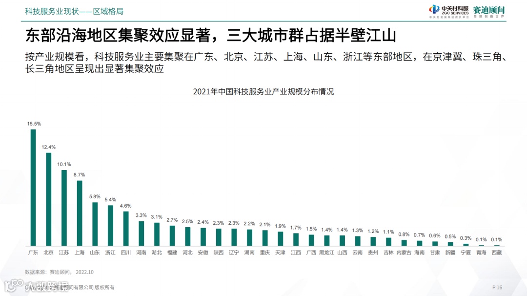 报告显示,东部沿海地区集聚效应显著,三大城市群占据半壁江山。科技服务业主要集聚在广东、北京、江苏、上海、山东、浙江等东部地区,在京津冀、珠三角、长三角地区呈现出显著集聚效应。北京作为中国首都,高校人才集聚,在知识创新、高水平科技成果产出方面一直处于领先地位。