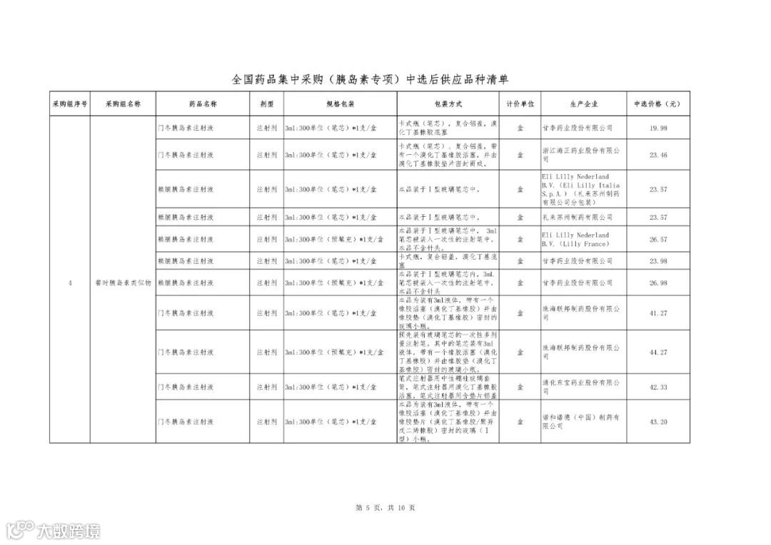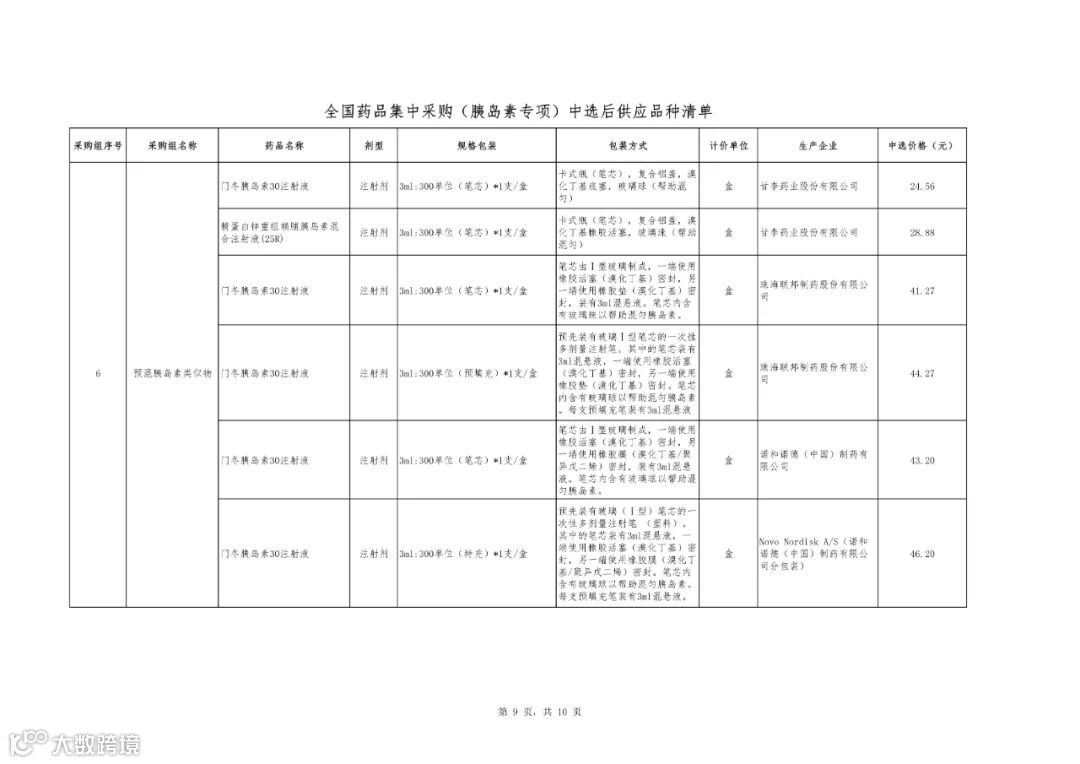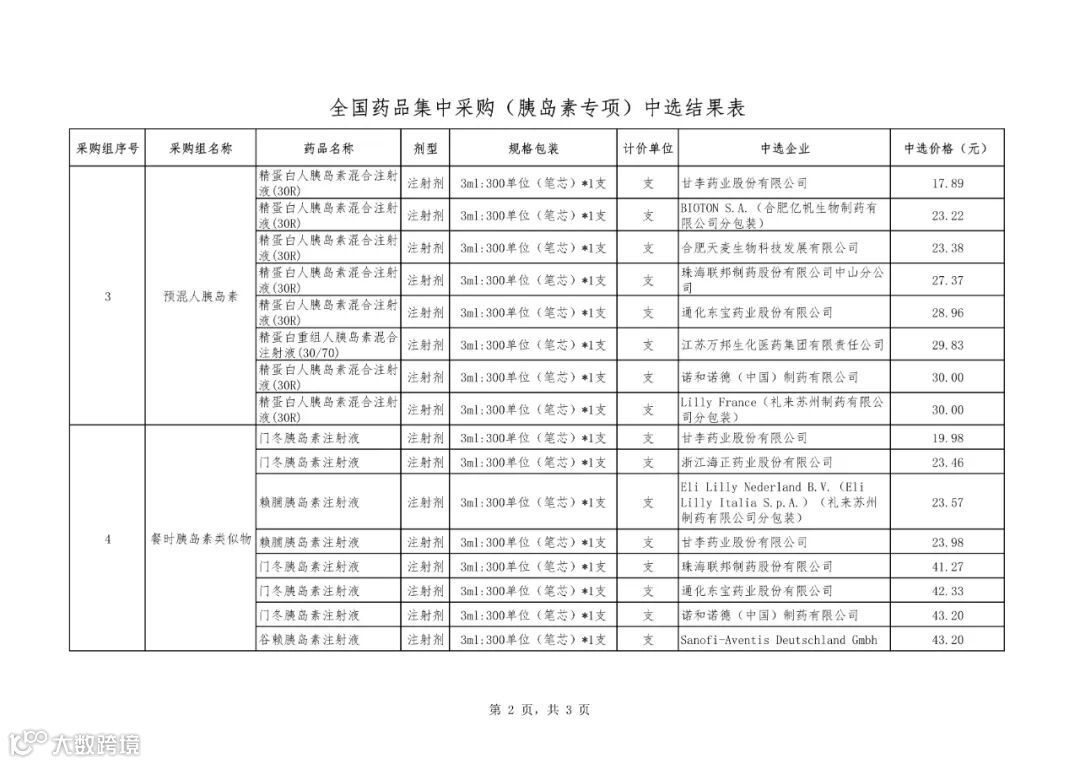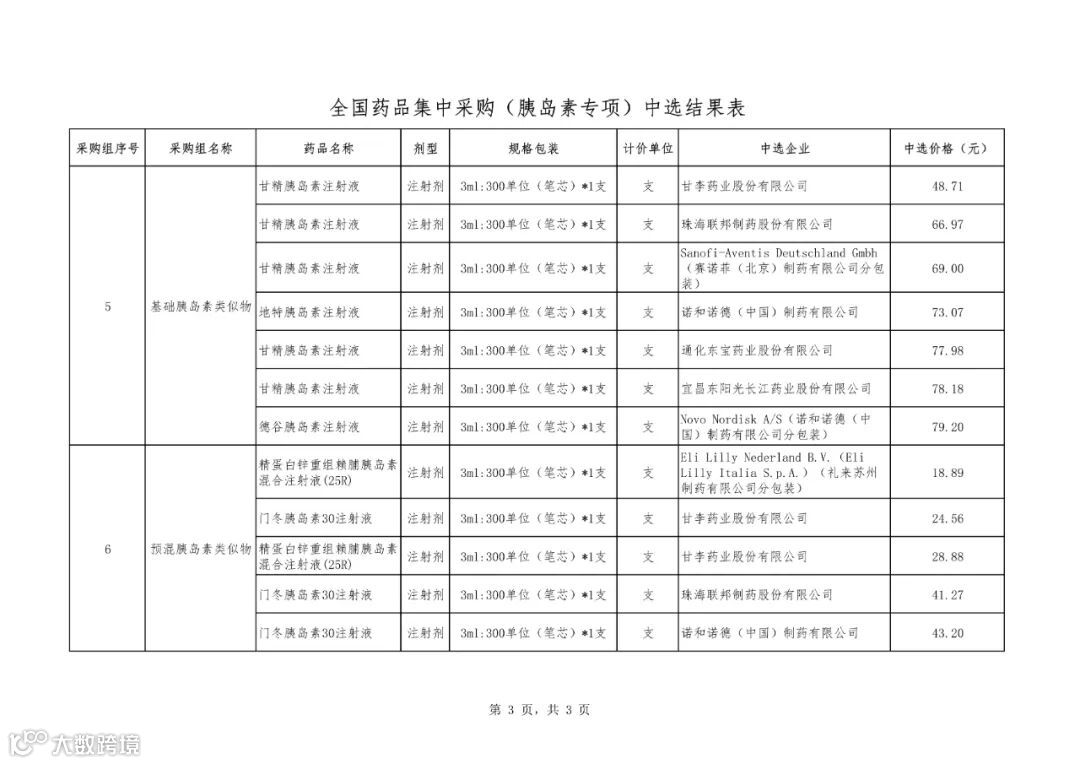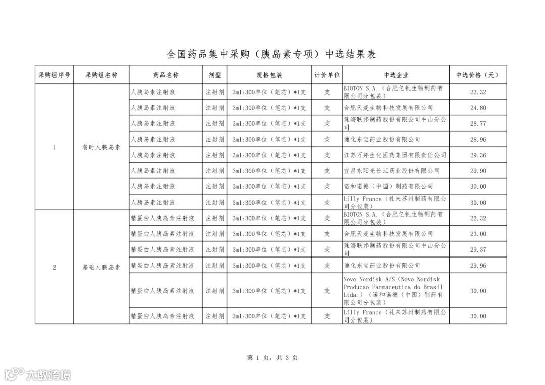 附件1:全国药品集中采购(胰岛素专项)中选结果表