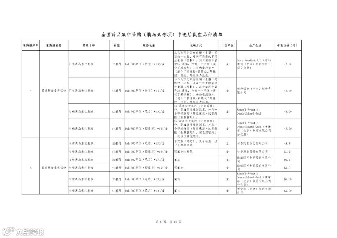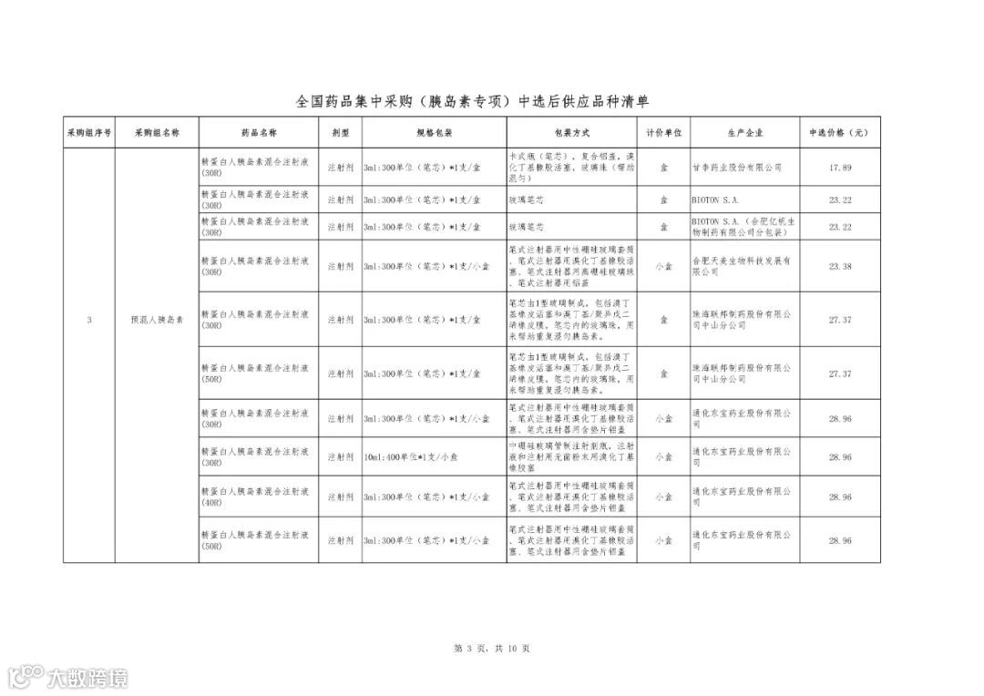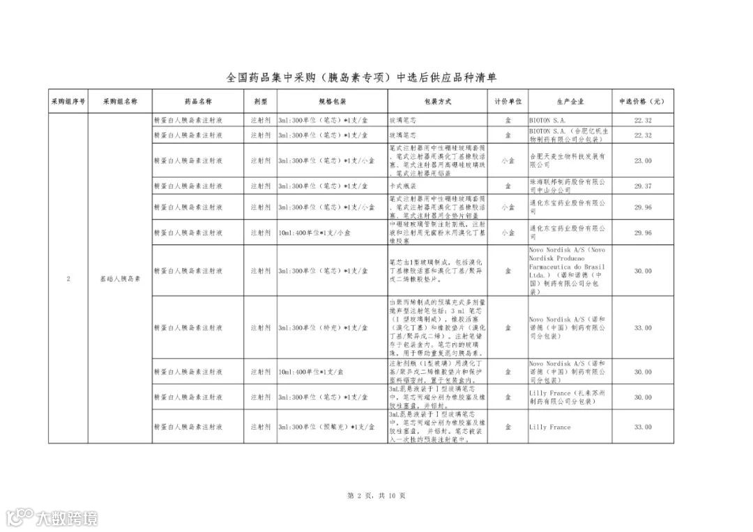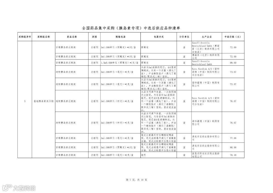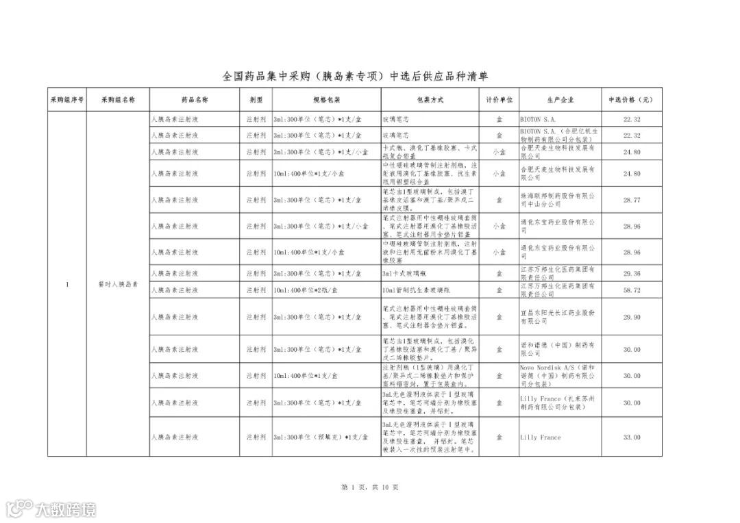 附件1:全国药品集中采购(胰岛素专项)中选结果表