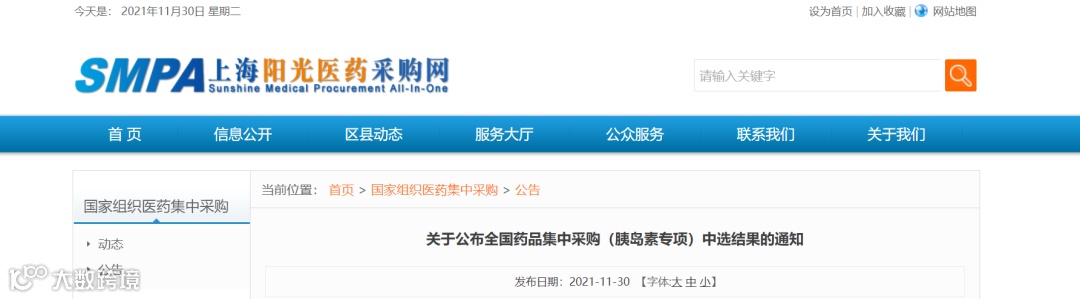 11 月 30 日,上海阳光采购网网讯,国家组织药品联合采购办公室发布《关于全国药品集中采购(胰岛素专项)中选结果的通知》。具体执行日期另行公告。