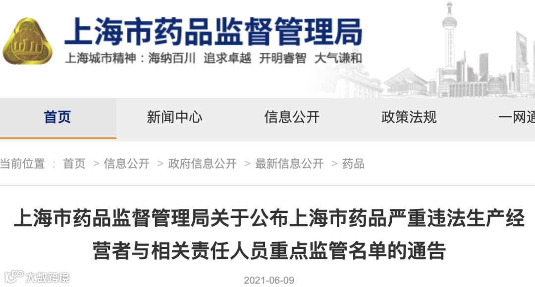 6月9日,上海市药监局公布了《上海市药品严重违法生产经营者与相关责任人员重点监管名单》,决定将曹惠吉等8人列入本市药品严重违法生产经营者与相关责任人员重点监管名单。