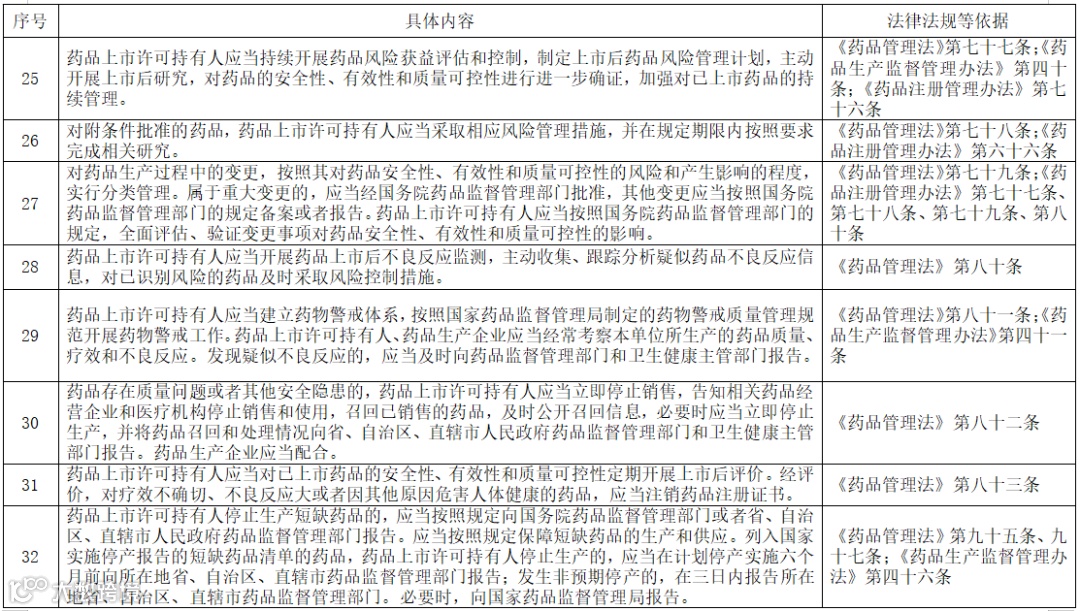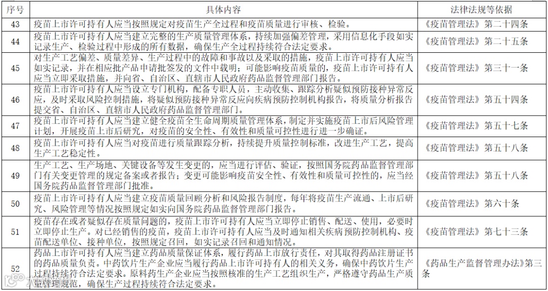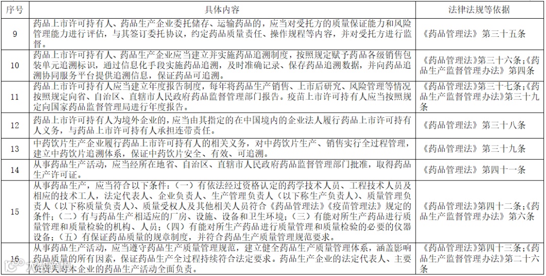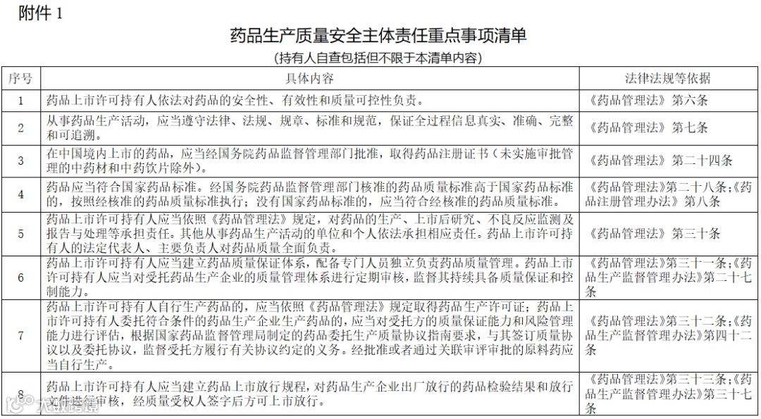 三、持有人要按照《药品管理法》《疫苗管理法》《药品生产监督管理办法》《药品注册管理办法》《药品生产质量管理规范》等法律、法规规定,全面落实药品生产质量安全主体责任,并对2019年以来主体责任落实情况开展自查,自查包括但不限于以下内容∶