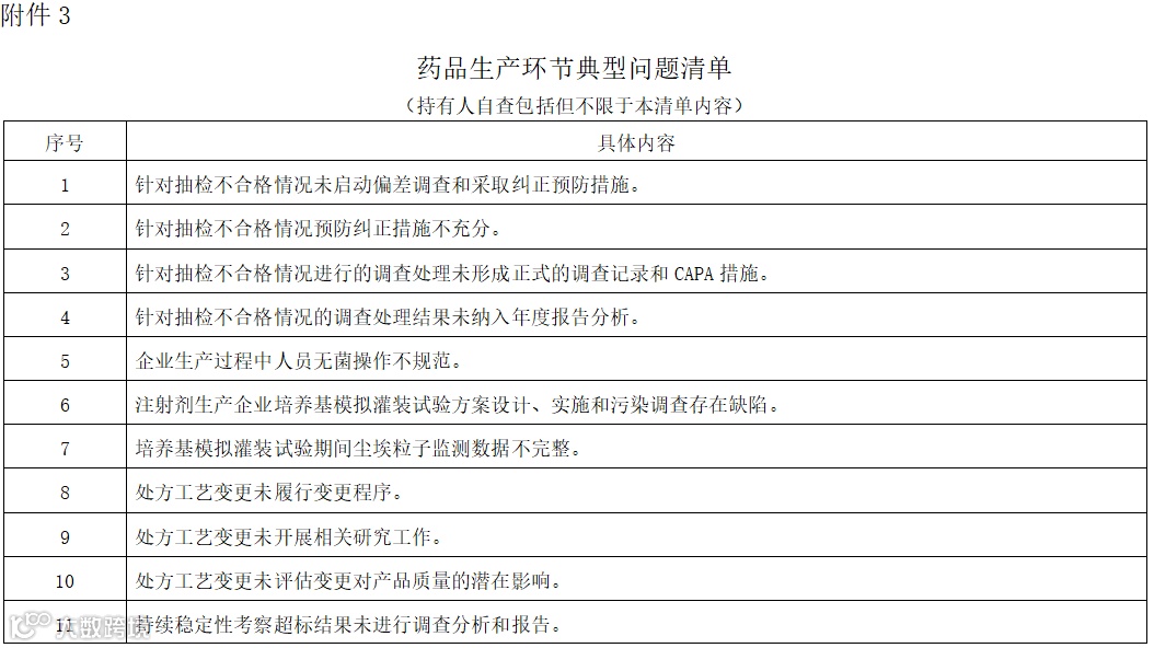 (三)对照《药品生产环节典型问题清单》(附件3),举一反三开展自查,查找药品生产质量管理中存在的风险隐患。
