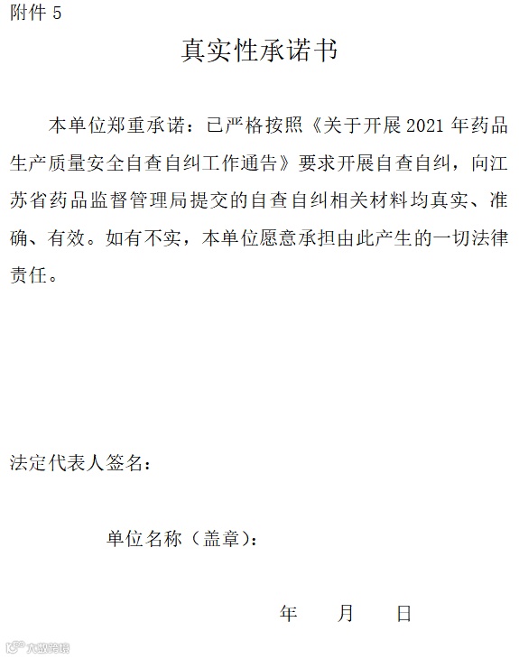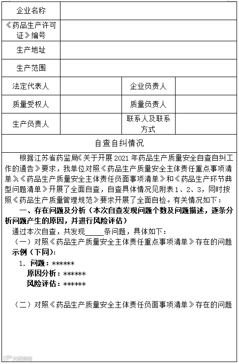 四、持有人应于2021年9月30日前完成自查。对自查发现的问题应立即采取有效整改措施,短期内不能完成整改的,应当制定切实可行的整改计划。对存在重大质量安全风险隐患的,持有人应立即停止生产活动并采取风险控制措施,同时报告省局药品生产监管处和所在地检查分局。2021年10月15日前,持有人应向所在地省局检查分局报送《药品生产质量安全自查自纠报告》(附件4)纸质版和电子版,同时递交《真实性承诺书》(附件5)。