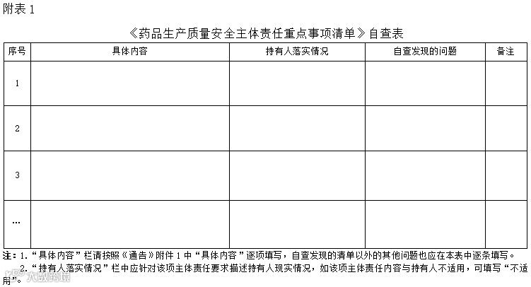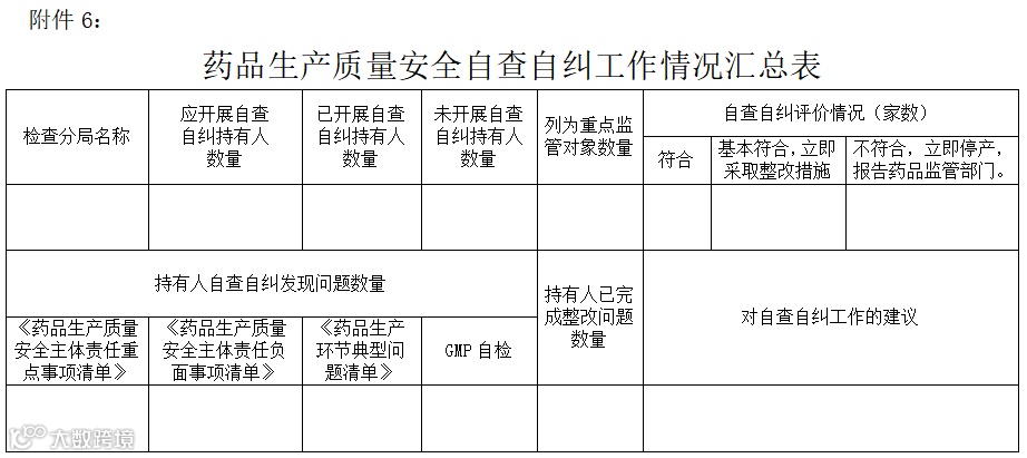 五、省局各检查分局要审核持有人自查自纠报告,并按风险管理原则开展检查。对未按期上报自查自纠报告的,或对自查自纠工作不认真、走过场,存在瞒报、漏报的持有人,要列入重点监管对象。省局各检查分局应于10月30日前向药品生产监管处报送《药品生产质量安全自查自纠工作情况汇总表》(附件6)。