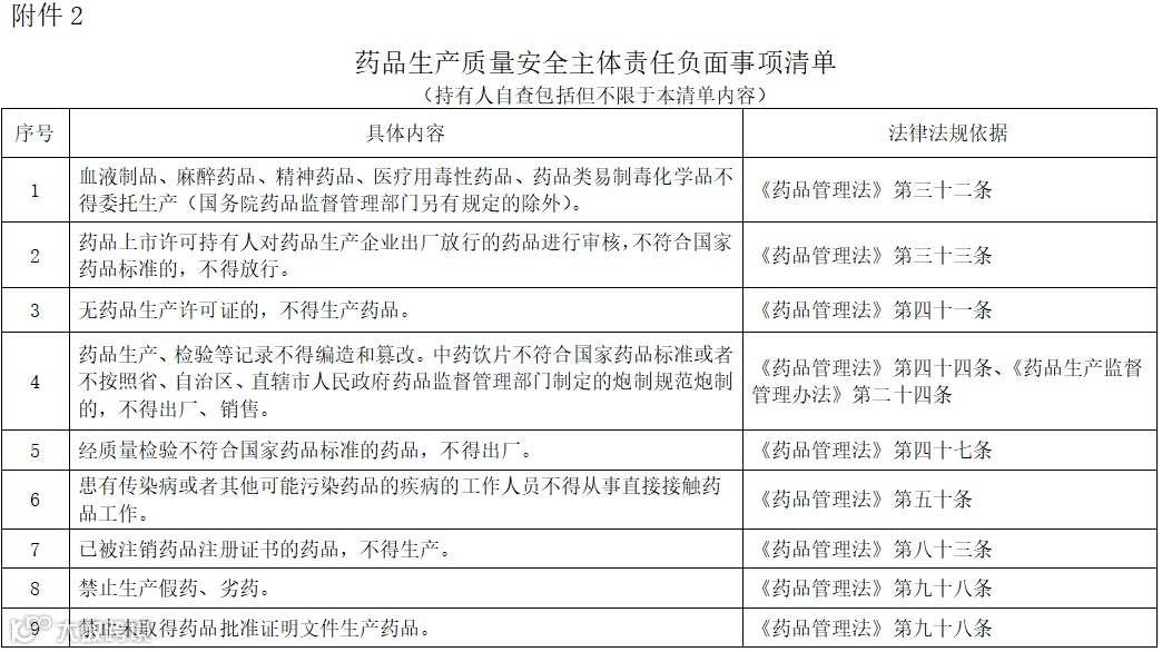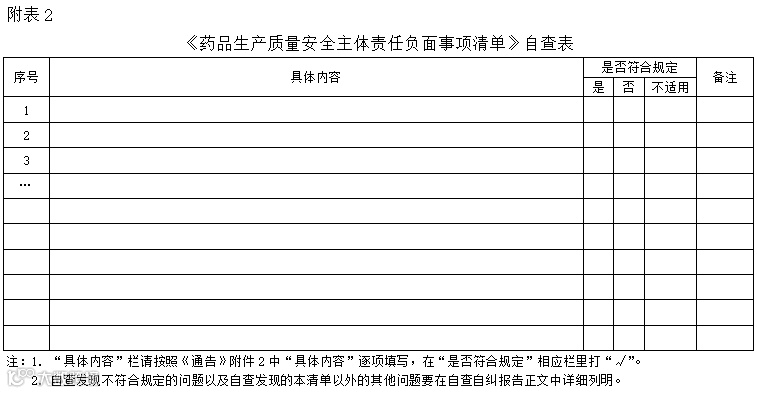 (一)对照《药品生产质量安全主体责任重点事项清单》(附件1)和《药品生产质量安全主体责任负面事项清单》(附件2)开展自查,评估企业生产质量管理是否符合相关法律法规要求。