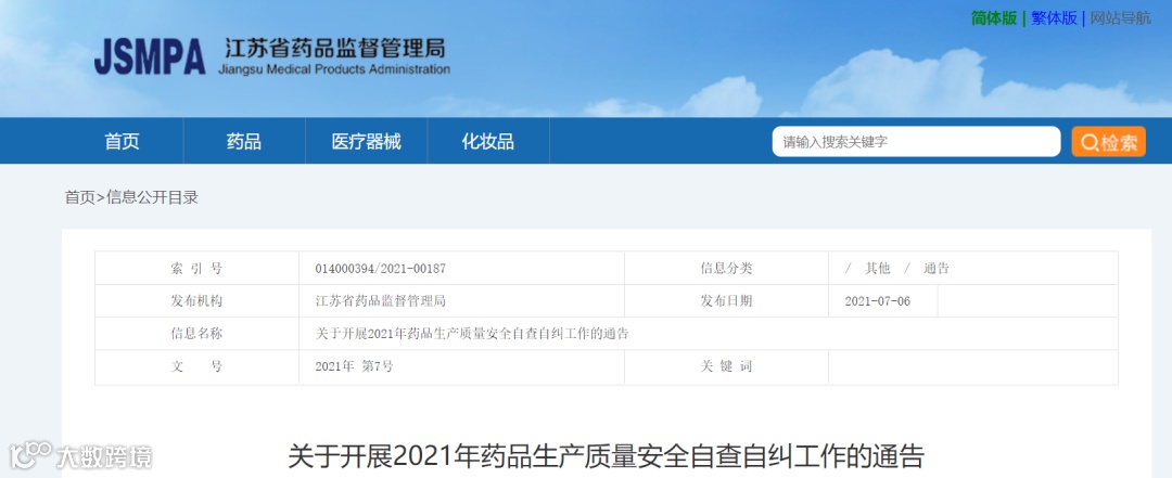 7月6日,江苏省药监局发布《关于开展2021年药品生产质量安全自查自纠工作的通告》。