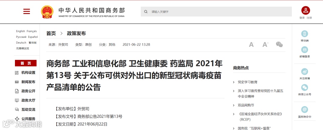 6月22日商务部网讯,商务部、工业和信息化部、卫生健康委、药监局四部门联合发布《商务部工业和信息化部卫生健康委药监局2021年第13号关于公布可供对外出口的新型冠状病毒疫苗产品清单的公告》。
