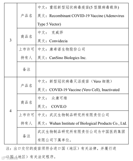 为做好新型冠状病毒疫苗出口工作,支持国际抗疫合作,现将经国家药品监督管理局批准或附条件批准上市注册申请的新型冠状病毒疫苗产品列入“可供对外出口的新型冠状病毒疫苗产品清单(中国企业研发生产)”。清单将根据国家药品监督管理局审批上市情况适时动态调整。