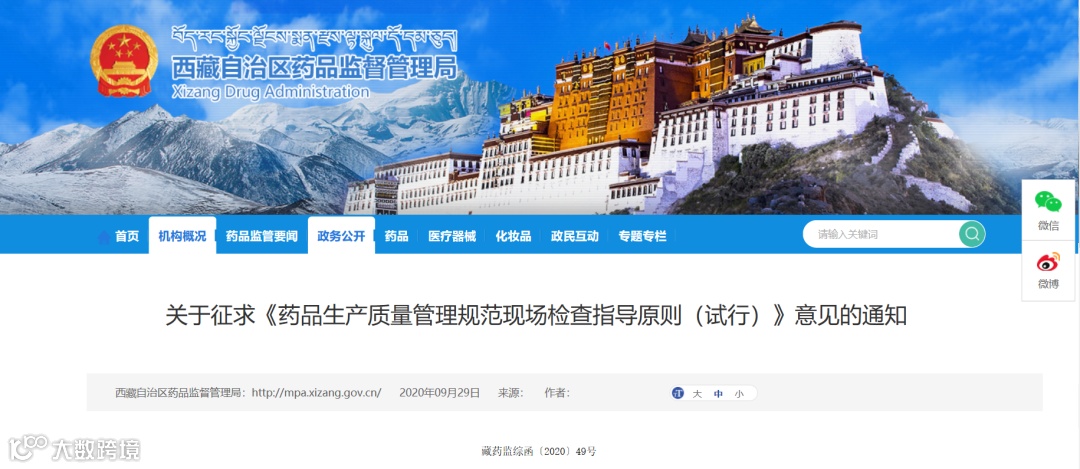 9月29日,西藏药监局发布关于征求《药品生产质量管理规范现场检查指导原则(试行)》意见的通知。