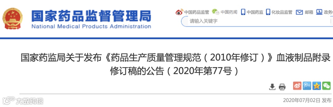 《中华人民共和国药品管理法》实施后,国家药品监督管理局按照《药品生产质量管理规范(2010年修订)》第三百一十条规定,对《血液制品》附录进行了修订,现作为《药品生产质量管理规范(2010年修订)》配套文件予以发布。本附录自2020年10月1日起施行。