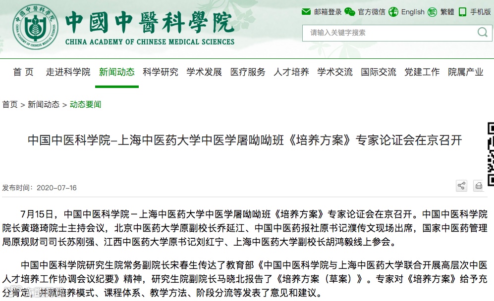 中国中医科学院官网显示,7月15日,中国中医科学院-上海中医药大学中医学屠呦呦班《培养方案》专家论证会在京召开。中国中医科学院研究生院常务副院长宋春生传达了教育部《中国中医科学院与上海中医药大学联合开展高层次中医人才培养工作协调会议纪要》精神。