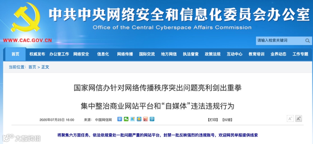 针对社会反映强烈的商业网站平台和“自媒体”扰乱网络传播秩序突出问题,国家网信办决定自2020年7月24日起在全国范围内开展集中整治。