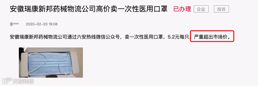 市市长留言称:“安徽瑞康新邦药械物流公司通过六安热线微信公众号,卖一次性医用口罩,5.2元每只。严重超出市场价。”