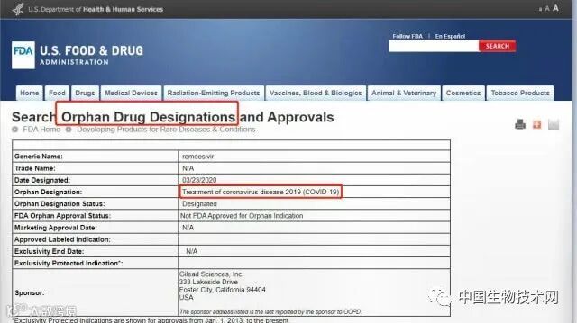 北京时间3月24日,美国食品和药品管理局(FDA)官网数据库显示,吉利德科学(Gilead Sciences)公司开发的在研抗病毒疗法瑞德西韦(remdesivir)获批孤儿药资格(Orphan Drug Designation),其适应症为冠状病毒疾病2019(COVID-19)。