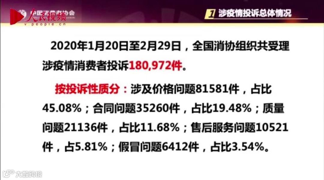 数据显示,2020年1月20日至2月29日,全国消协组织共受理涉疫情消费者投诉180972件——其中,按商品和