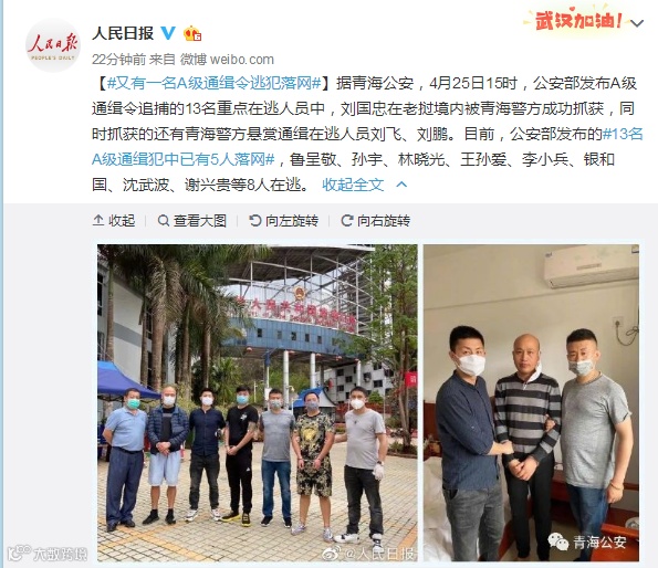 【又有一名A级通缉令逃犯落网】据青海公安,4月25日15时,公安部发布A级通缉令追捕的13名重点在逃人员中,刘国忠在老挝境内被青海警方成功抓获,同时抓获的还有青海警方悬赏通缉在逃人员刘飞、刘鹏。目前,公安部发布的13名A级通缉犯中已有5人落网,鲁呈敬、孙宇、林晓光、王孙爱、李小兵、银和国、沈武波、谢兴贵等8人在逃。