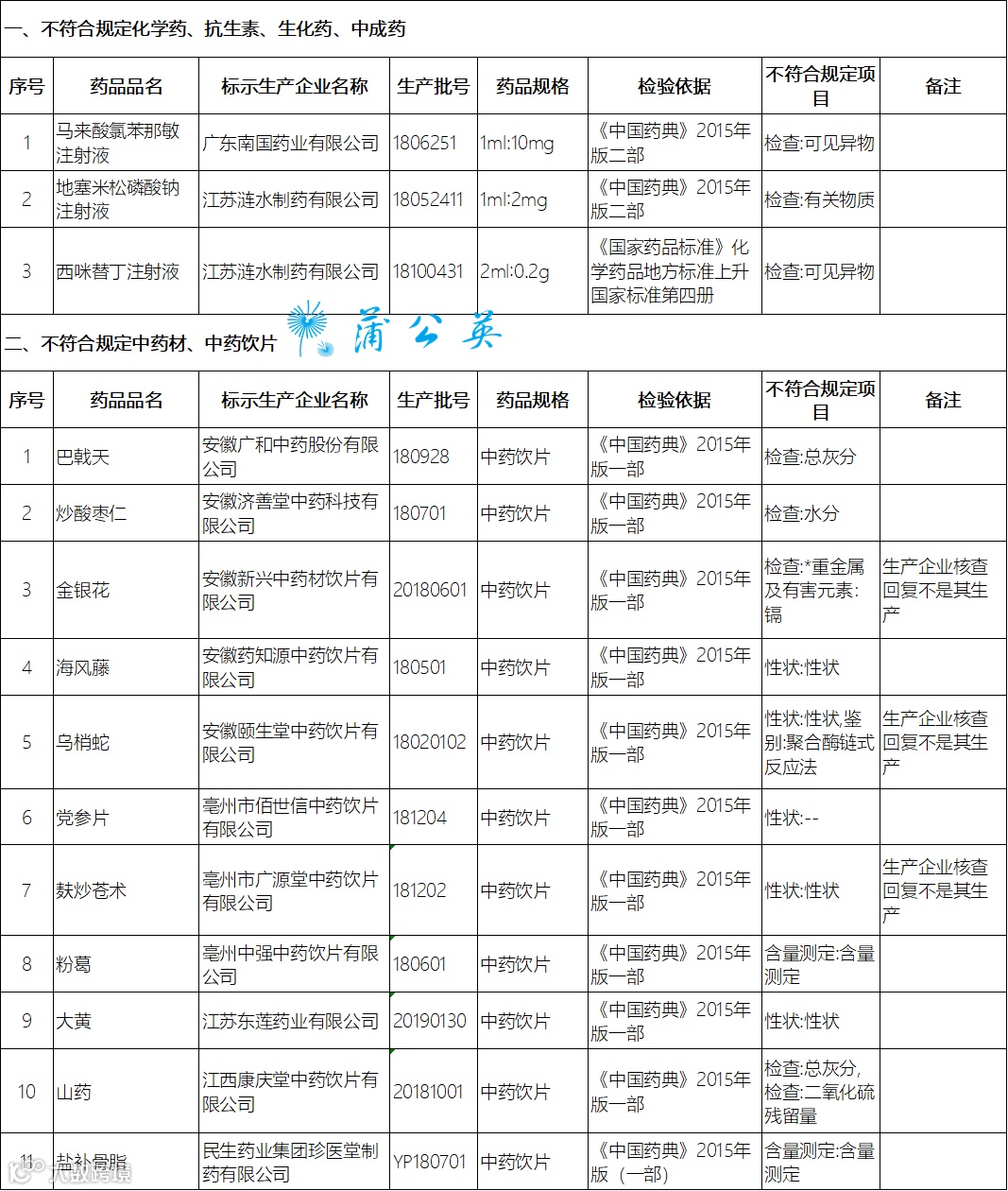 中药饮片11批次:巴戟天、炒酸枣仁、金银花、海风藤、乌梢蛇、党参片、麸炒苍术、粉葛、大黄、山药、盐补骨脂