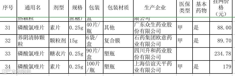 2月20日,山东省公共资源交易中心网站发布了第四批新冠肺炎相关防控药品直接挂网的通知,其中,磷化酸氯喹片三家药企挂网,价格分别为: