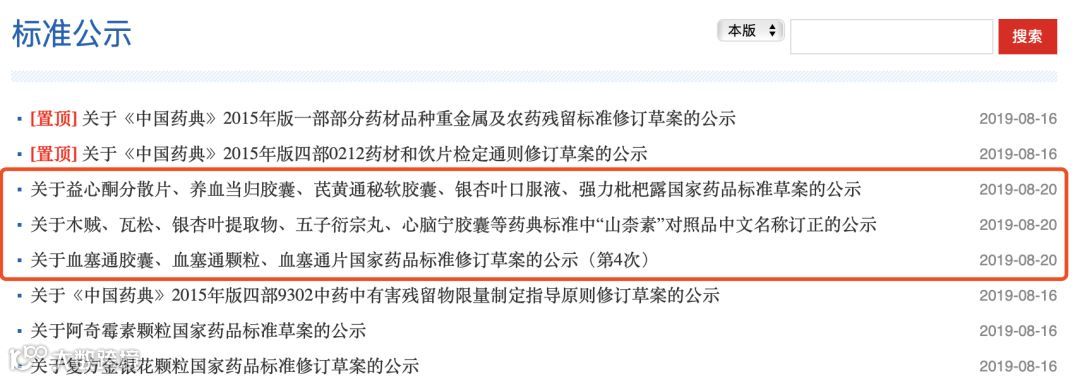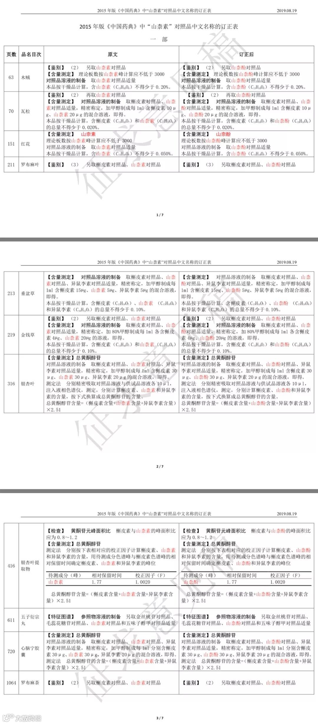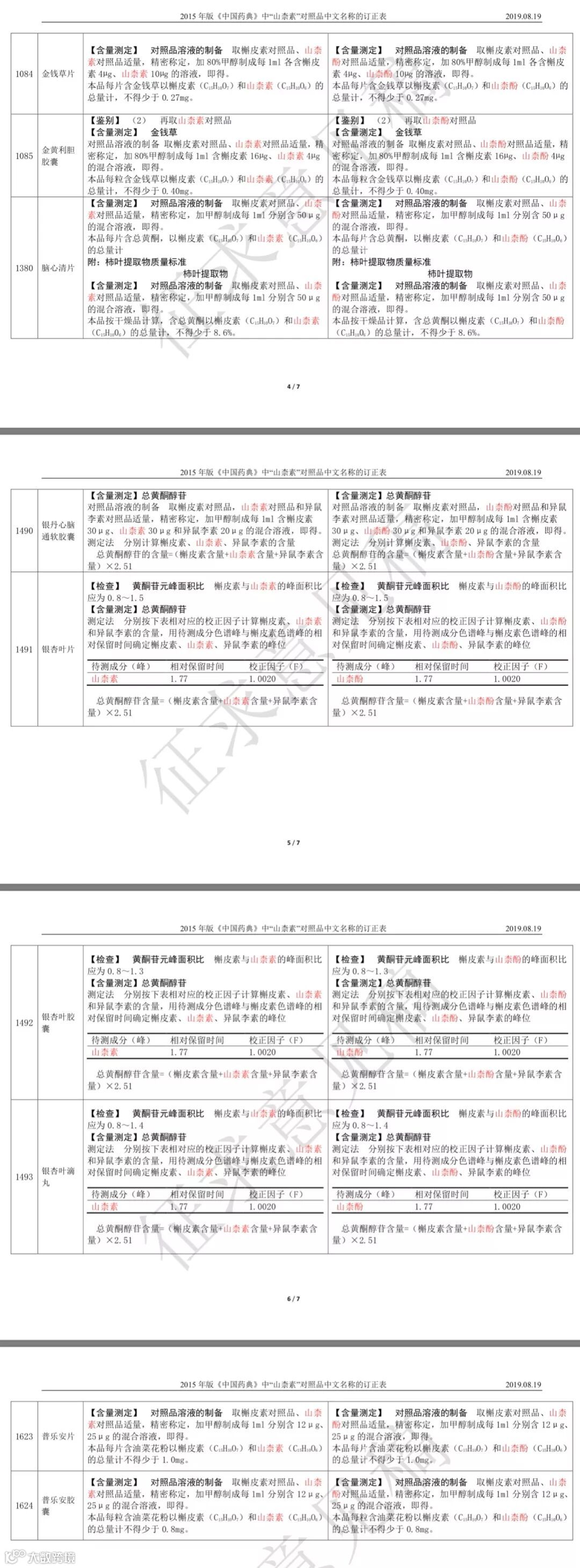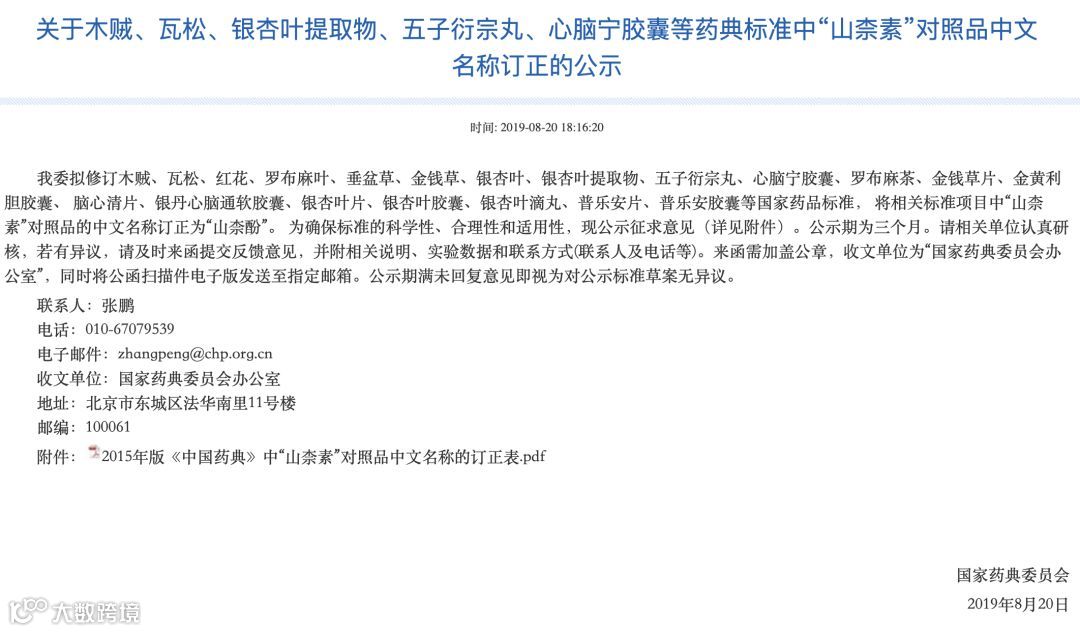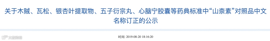 我委拟修订木贼、瓦松、红花、罗布麻叶、垂盆草、金钱草、银杏叶、银杏叶提取物、五子衍宗丸、心脑宁胶囊、罗布麻茶、金钱草片、金黄利胆胶囊、 脑心清片、银丹心脑通软胶囊、银杏叶片、银杏叶胶囊、银杏叶滴丸、普乐安片、普乐安胶囊等国家药品标准, 将相关标准项目中“山柰素”对照品的中文名称订正为“山柰酚”。