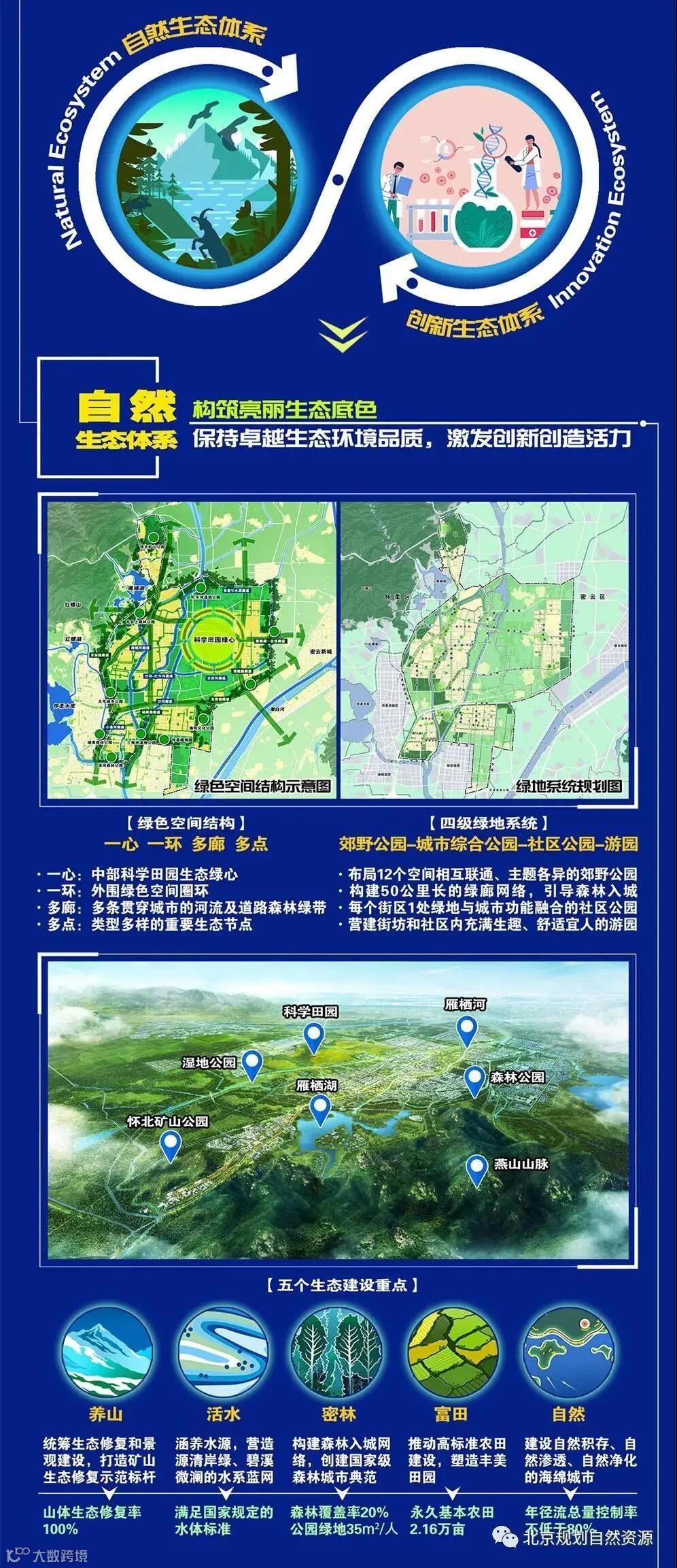 控规着力突出北京怀柔综合性国家科学中心的源头优势、国家重大科技基础设施布局的强度优势、首都生态涵养区的自然人文优势,围绕“1+3”的总体思路,构建“创新生态体系”与“自然生态体系”高度融合的整体格局。