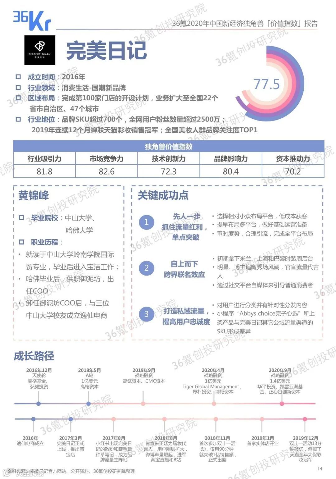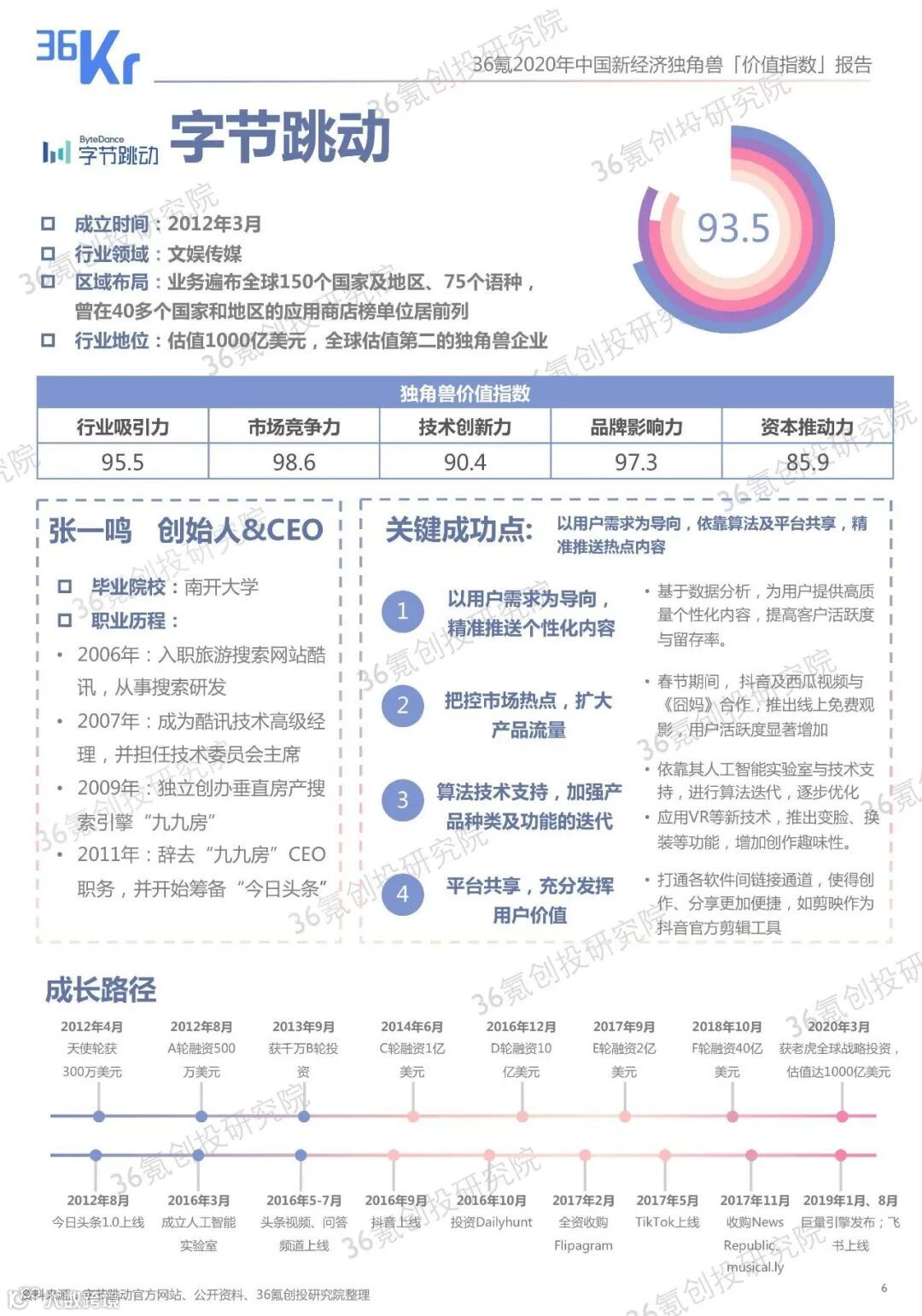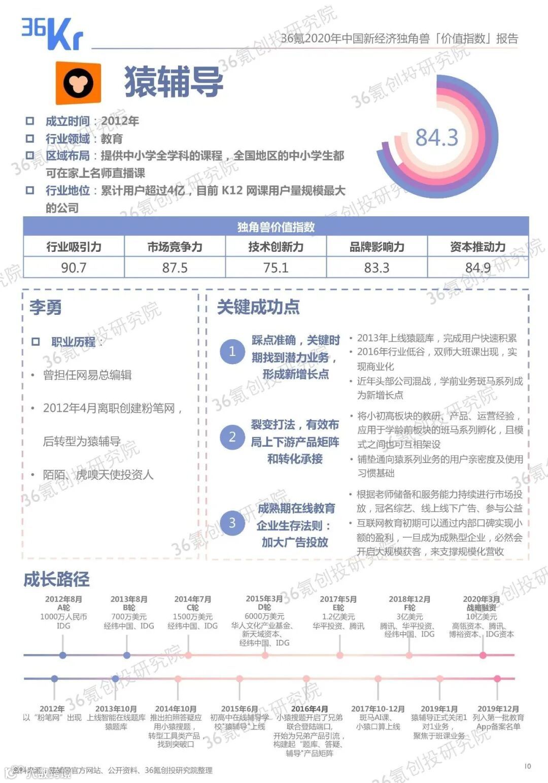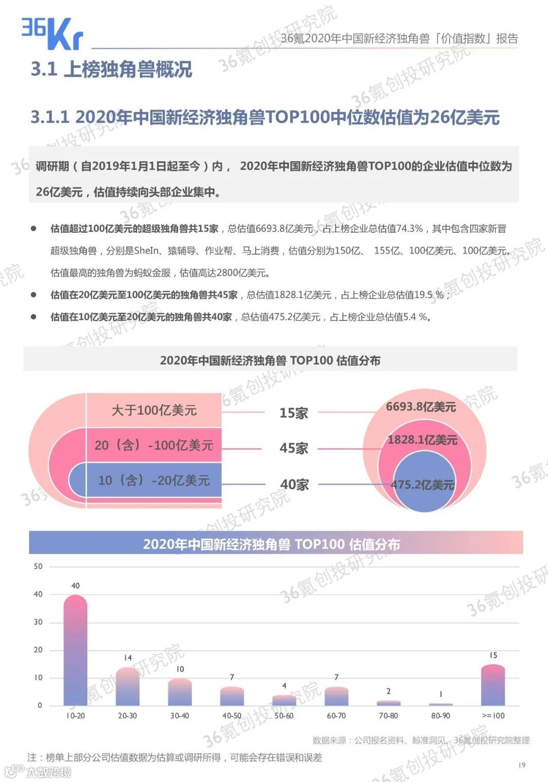 36氪创投研究院根据学术界和一级市场参与者们对独角兽企业的成长机制及估值研究,结合问卷调研、桌面研究、数据整理等方式,回溯了每一家独角兽企业自其成立以来的表现,并建立「价值指数模型」为独角兽们评分,进而得出了100家代表中国新经济的独角兽企业。