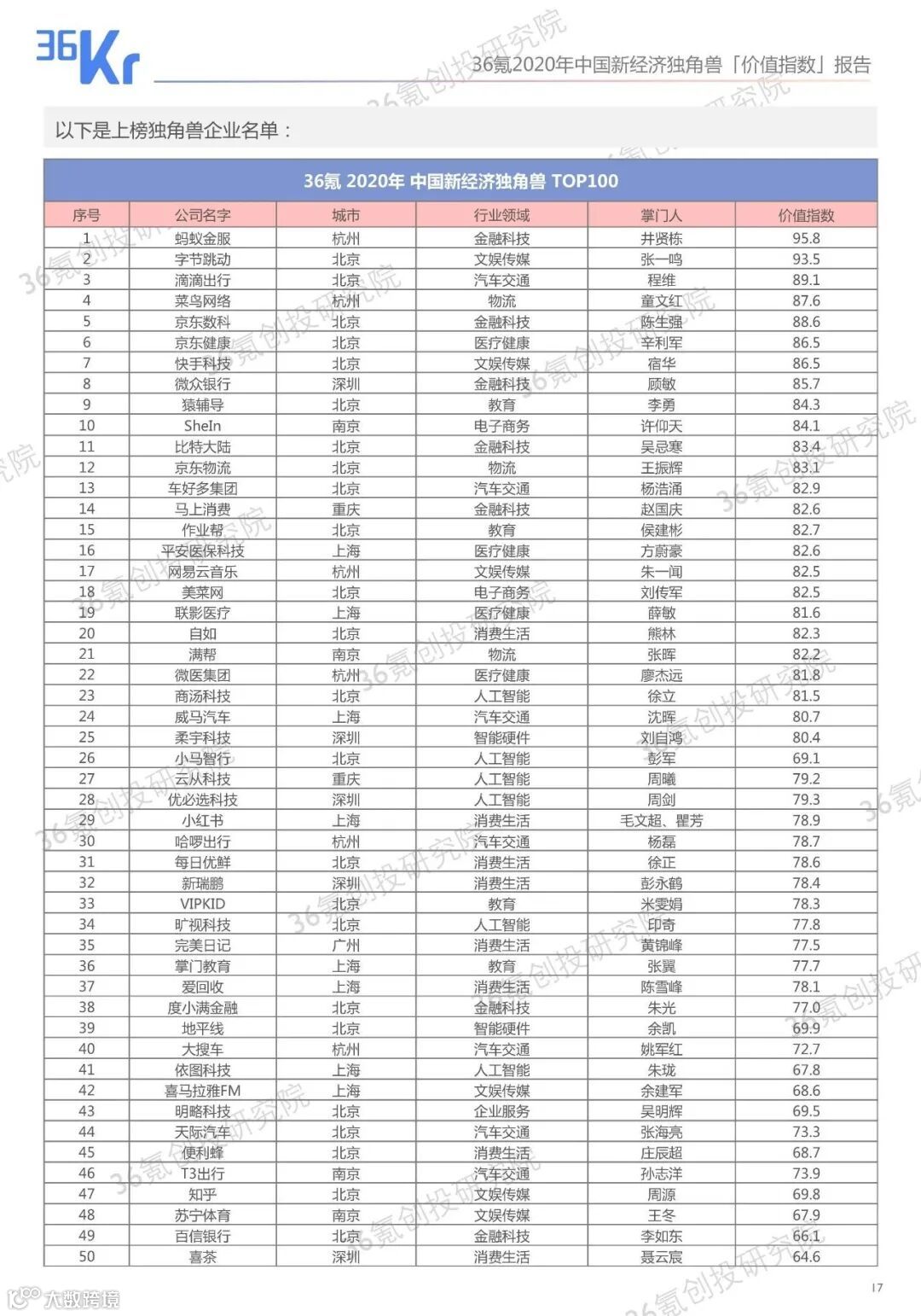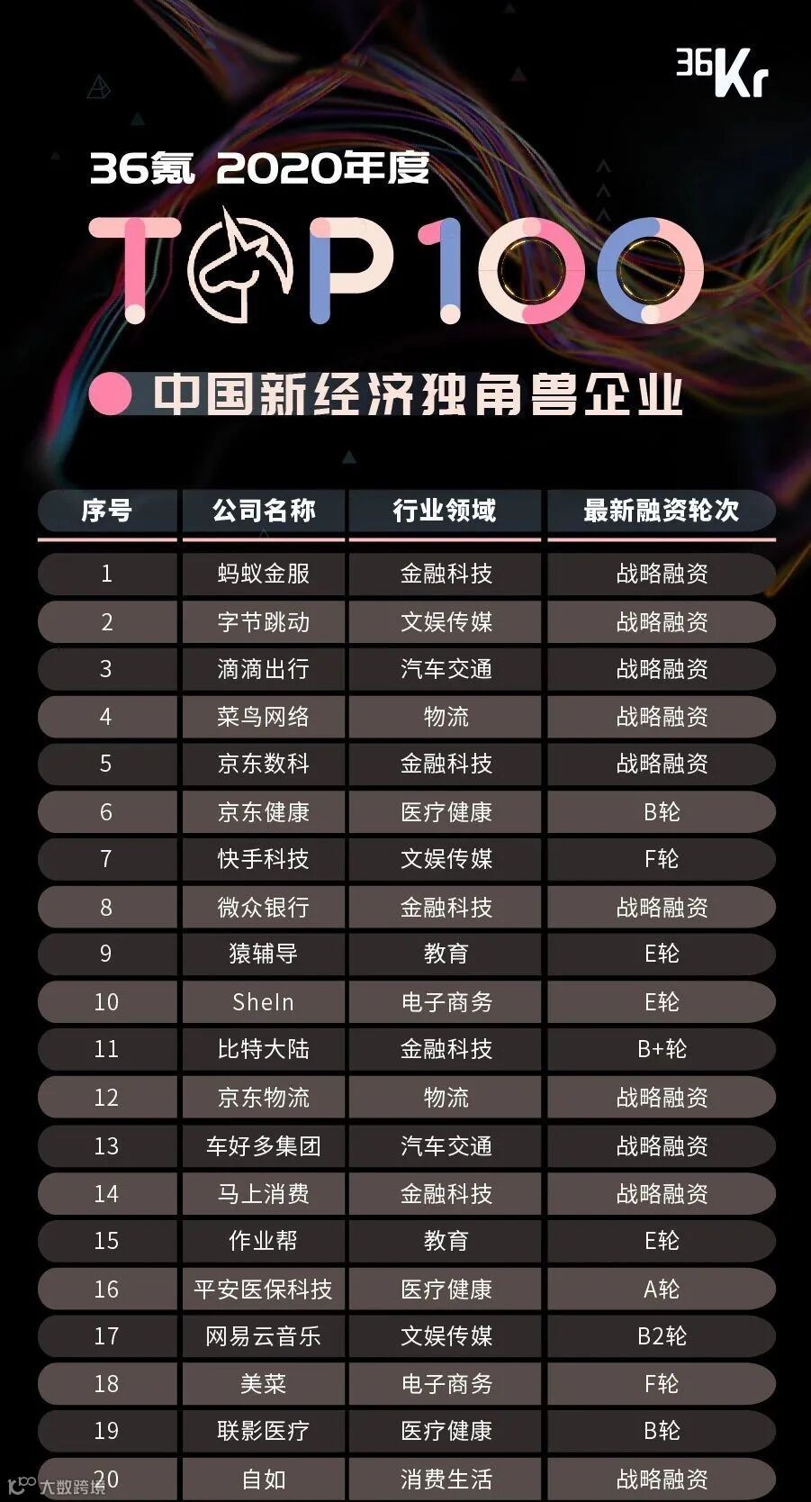 近日,36氪《2020年度中国新经济独角兽TOP100暨「价值指数」》报告正式发布。