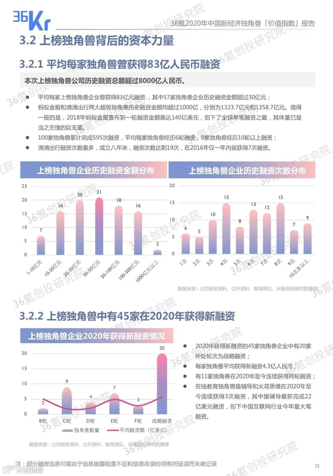 融资速度和规模从早期向后期递增,资本参与程度加强,上榜独角兽平均经历6轮融资;