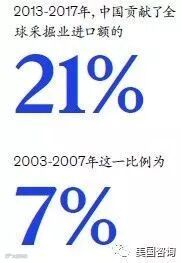 随着中国的工业化不断取得进展,全球上游产业对中国的依存度均有所提高。那些为进一步加工提供原材料的行业都要依赖中国的进口。中国制造业的增长大幅提升了对原材料和中间品(用于加工成最终商品)的需求,人均收入的增长也推升了中国的整体商品需求。2003-2007年间,中国贡献了全球采掘业进口额的7%,在2013-2017年间这一比例更升高到21%。