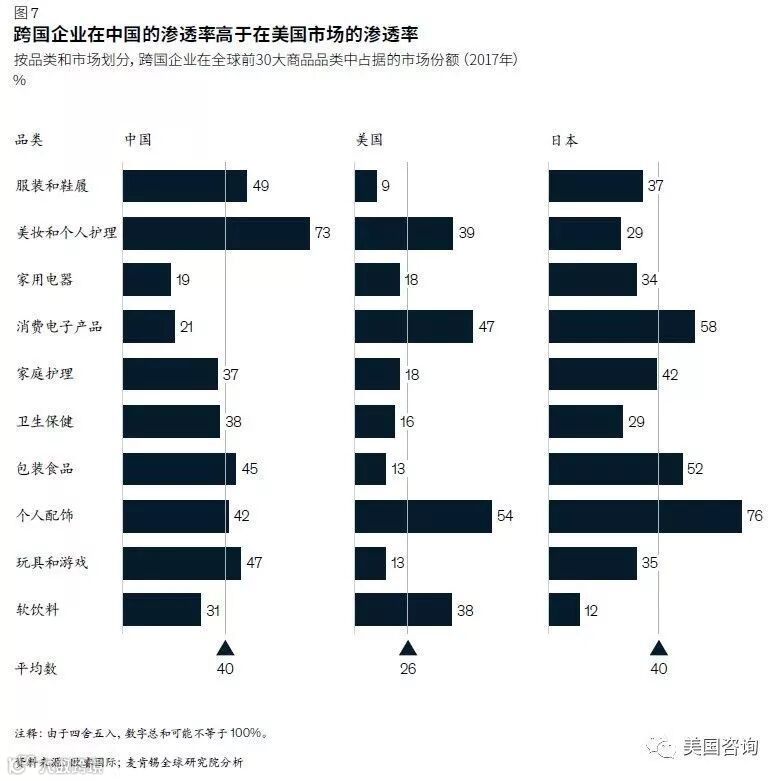 中国消费市场已经与全球高度整合。自从2001年加入世贸组织以来,中国逐步降低了外企在华运营的门槛,并从2004年开始允许外国投资者在国内所有市场经营零售业务。中国还开放了分销领域,允许外资分销企业申请全国性牌照。因此,跨国企业在中国市场的渗透率相当可观。我们分析了十大消费领域的30种顶尖品牌,发现2017年在华外企的平均市场渗透率为40%,在美国这一比例仅为26%。某些行业的渗透率甚至更高,例如在美妆和个人护理领域中跨国企业的渗透率高达73%(见图7)。