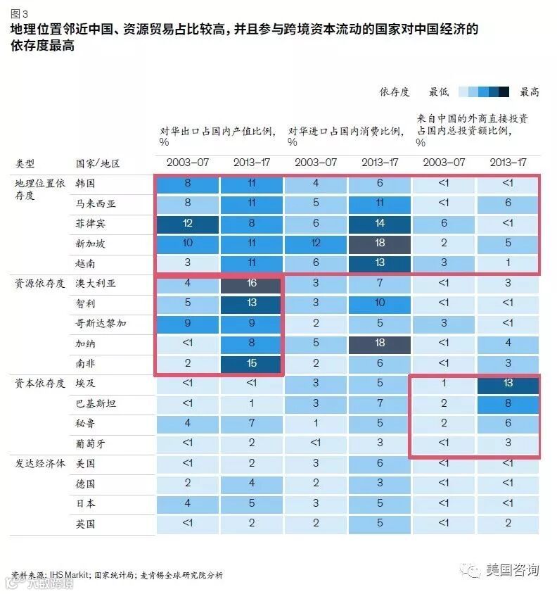 我们从国家层面研究了各个经济体对中国的进口(国内产值出口到中国的比例)、出口(来自中国的进口额占国内消费总额的比例)和资本(来自中国的外商直接投资占国内投资总额的比例)的依存度。自2007年以来,在我们研究的73个经济体中,有69个经济体的国内产值相对于中国的进口的依存度上升;有72个经济体的国内消费相对于中国出口的依存度上升;还有58个经济体的国内投资相对于中国资本的依存度上升(见图3)。