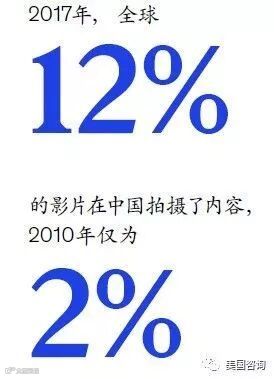 中国为了向世界发扬本国文化而投入了大笔资金,其中一个表现就是全球孔子学院数量已从2010年的298所增加到了2017年的548所。近年来中国正在积极为全球文化娱乐产业提供融资,辅之以有竞争力的制作设施,已经吸引了越来越多的影片来华拍摄:2017年全球票房前50强的电影中,有12%的影片至少在中国拍摄了一部分内容,而2010年仅有2%。不过,尽管投资甚巨,但中国尚未对全球范围内的主流文化产生显著影响。仅举一例:中国电视剧的出口额仅为韩国的1/3,而中国十大顶尖音乐人在全球领先的一个流媒体平台上的订阅总量仅为韩国十大顶尖艺人的3%。