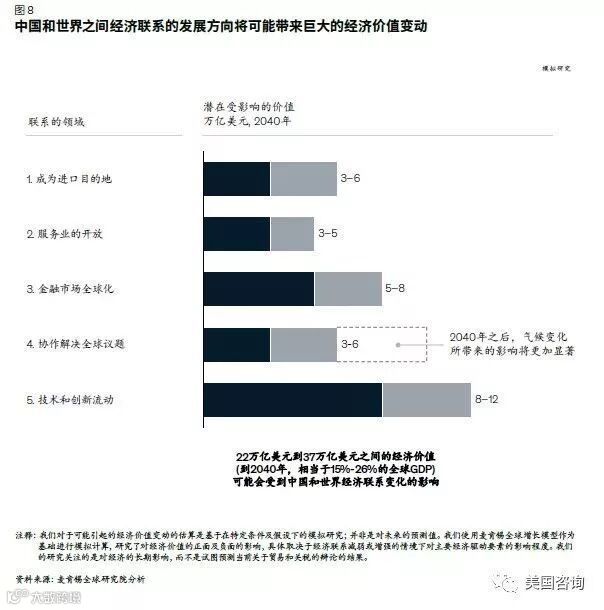 我们使用麦肯锡全球增长模型进行模拟计算,并利用外部研究对结果进行了调整,最终发现:如果上述5项趋势均向加强联系发展,则中国和世界到2040年有望创造巨大的经济价值,而减弱联系则可能令巨大的经济价值面临风险。这种价值绝大部分都表现为对GDP的影响,其余则表现为其他价值形式,例如在解决气候变化问题时选择不同,将导致社会成本出现或升或降的分化。到2040年,可能受到影响的总价值或将达到22〜37万亿美元,大约相当于全球GDP的 15%~26%(见图8) 。