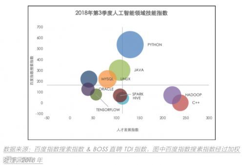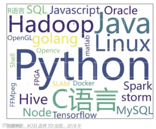 根据2018年前三季度AI类职位描述中出现频率最高的25项技能展示发现,Python、Java、Hadoop和C语言是需求量最大的几种技能。